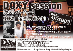 【後藤浩二DOXYsession】 ホストプレイヤー 後藤浩二(p)/谷井直人(b) 楽器、歌がお好きな方ならどなたでも参加OK♪ ジャズ、ポップス、、様々なジャンルで ミュージシャンがその場で伴奏してくれるという、 何とも贅沢な企画♪ 我こそは!!という方のご来場お待ちしております!!