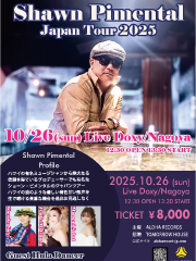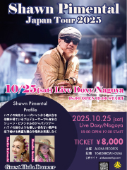 【Shawn Pimental】 Shawn Pimental(g) ハワイのグラミー賞と称される“Nā Hōkū Hanohano Award”を幾度にもわたって受賞し、アメリカのテレビドラマ、番組、テレビ業界の功績を称えるエミー賞の受賞者でありグラミー賞にもノミネートされた音楽プロデューサー兼アーティスト「ショーン・ピメンタル」の来日ツアーの名古屋公演2daysがDOXYで開催です! ※本公演の受付は終了しております ※全席自由席 | open12:30 start13:30 |