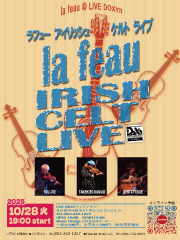 【ラフューアイリッシュケルトライブ】 独自の解釈でのアイリッシュ、ジプシー、ジャズ、オリジナル楽曲など様々なジャンルを演奏し、思い感じるがままに表現するフィドラー"悠情"が日本人アイリッシュ・フィドラーの第一人者として活躍を続ける"功刀丈弘"とヨーロッパの民族音楽を軸に、国内を中心に幅広く活動中のギタリスト"福江元太"のトリオ編成で会場を盛り上げます! 3人が奏でる激しくも自由、そして本格派アイリッシュサウンドをお楽しみに♪ ※全席自由席 |